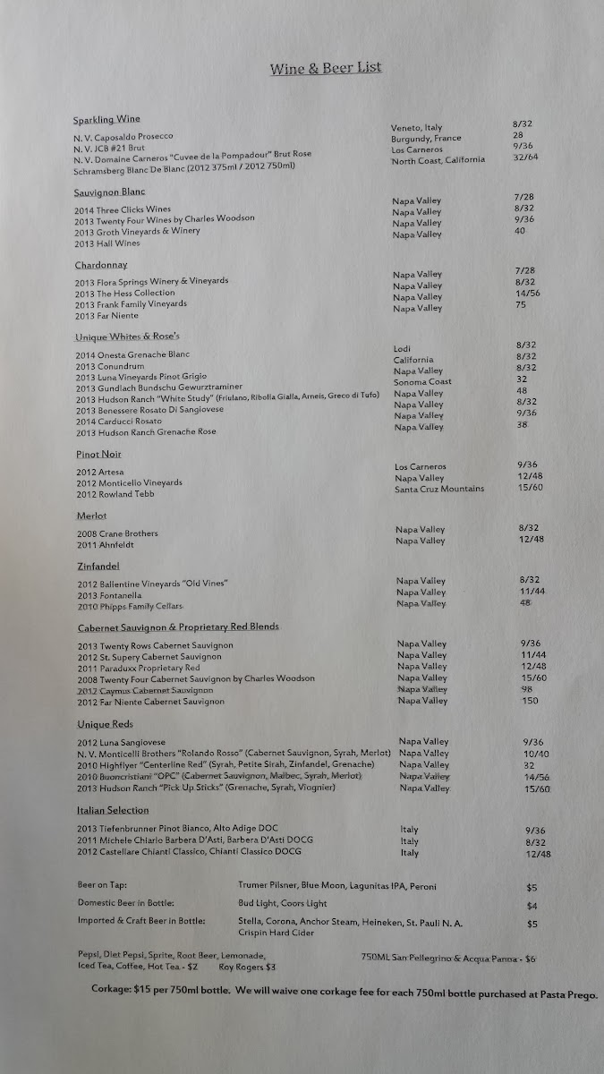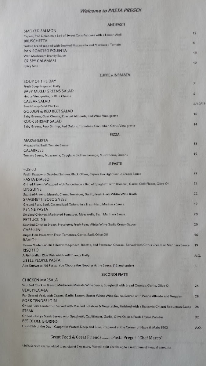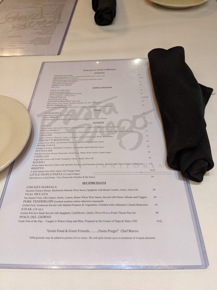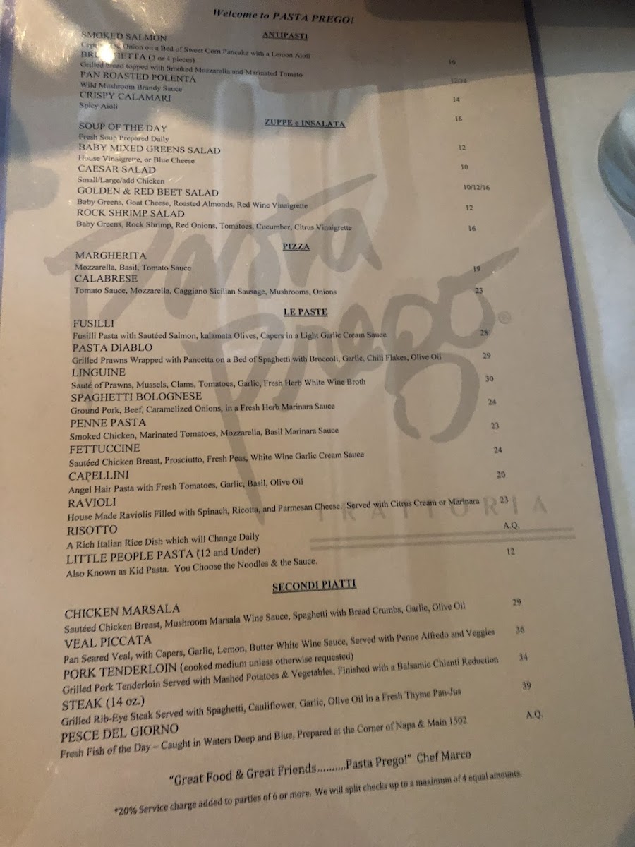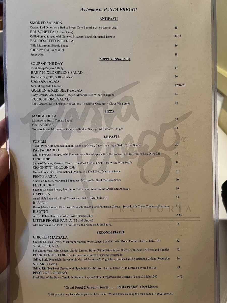 Pasta Prego Menu